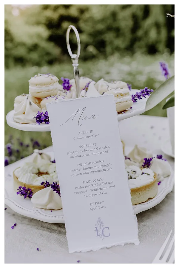 Bei einem Menü an einer festlich gedeckten Tafel kann nach Herzenslust geschlemmt werden. Auch hier haben wir die Menükarten im Look der Hochzeitseinladung gestaltet.