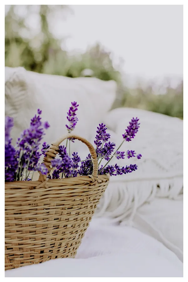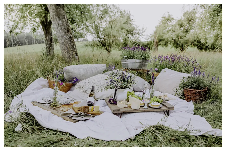 Das Picknick auf der Wiese mit hellen Kissen, umgeben von Lavendel, ist nicht nur eine schöne Idee für die Hochzeit. Auch für ein Picknick mit Freunden, den Brautjungfern oder dem Liebsten ist dies ein wirklich schönes Setting.