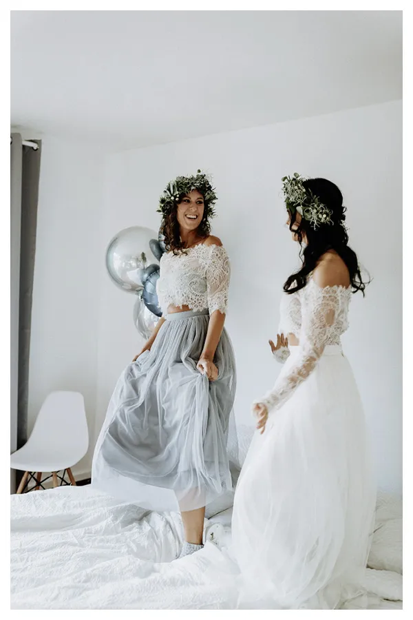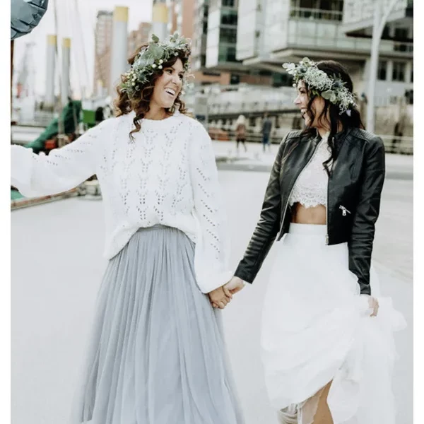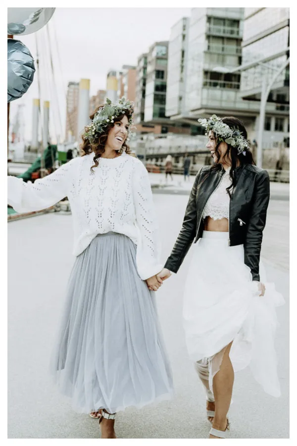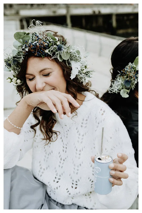 Ein flauschiger Pullover, ein schwingender Rock. Lässiger und kuscheliger geht es kaum. Elbbraut in Hamburg ist die Adresse für euch, wenn ihr besondere Brautkleider und Accessoires für eure Winterhochzeit sucht.