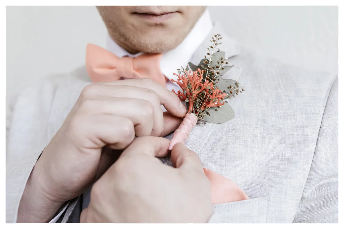 Unterstrichen wurde das Arrangement durch wunderschönen Blumenschmuck von Blumenzauber. Die gelbe Craspedia – auch Trommelstock genannt – ist vielseitig einsetzbar. Als Blumenschmuck an Frederiks Revers griff Sie unser Farbkonzept wieder auf und wirkte dabei wunderbar frisch.