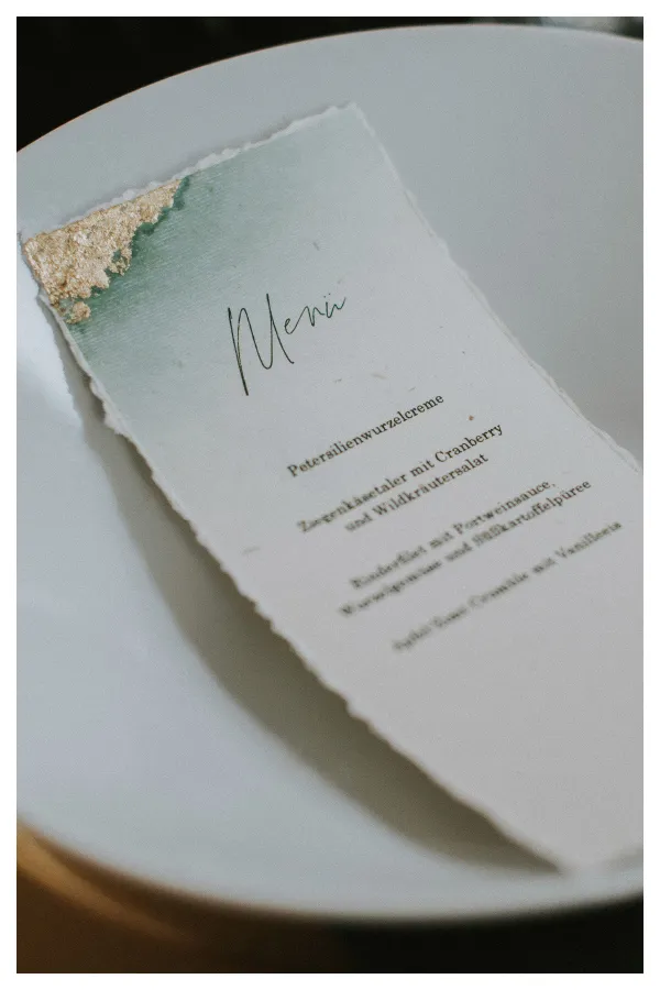 Am Anfang jeder Hochzeit steht die Hochzeitseinladung oder die Save the Date Karte. Vielleicht auch in diesen Zeiten die Change the Date Karte. Die Hochzeitseinladung für eure Winterhochzeit, gedruckt auf hochwertigem Gmund Stroh Papier im Fine-Art-Look mit gerissenen Kanten und von Hand mit Blattmetall veredelt, bildet zusammen mit dem marmorierten Hochzeitssiegel einen herrlich romantischen und edlen Rahmen. Farblich haben wir uns hier an dem Interior der Location orientiert. Das dunkle Grün ist winterlich, ohne weihnachtlich zu sein. Perfekt für eure Winterhochzeit.