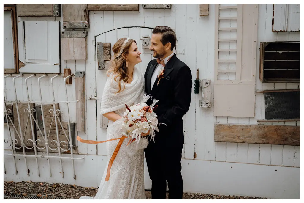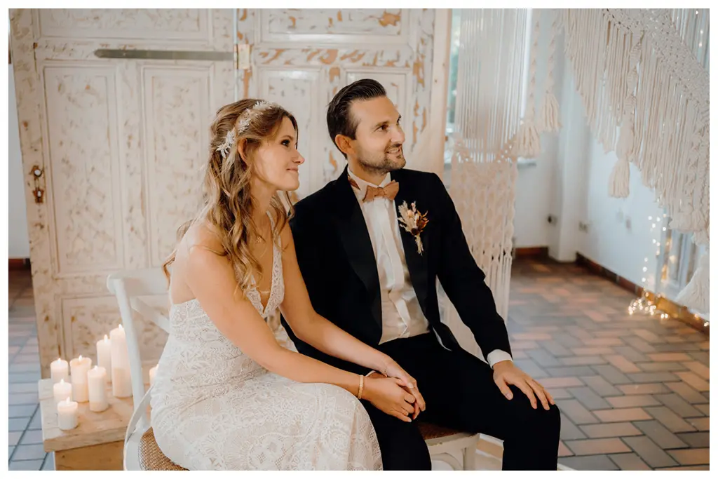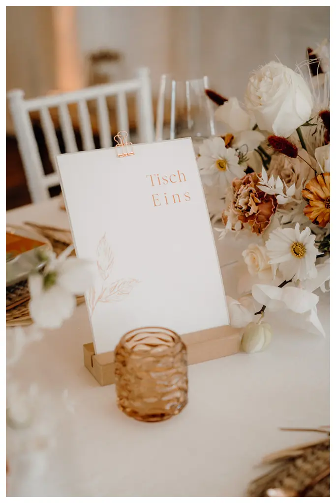 Vielmehr elegant, und modern zugleich. Die Farbpalette für diese Hochzeit bestand aus Naturtönen. Zartes Nude, Weiß, mit Akzenten in Gold und Rostrot. Letzteres kam vor allem bei der Boho-Hochzeitspapeterie zum Einsatz.