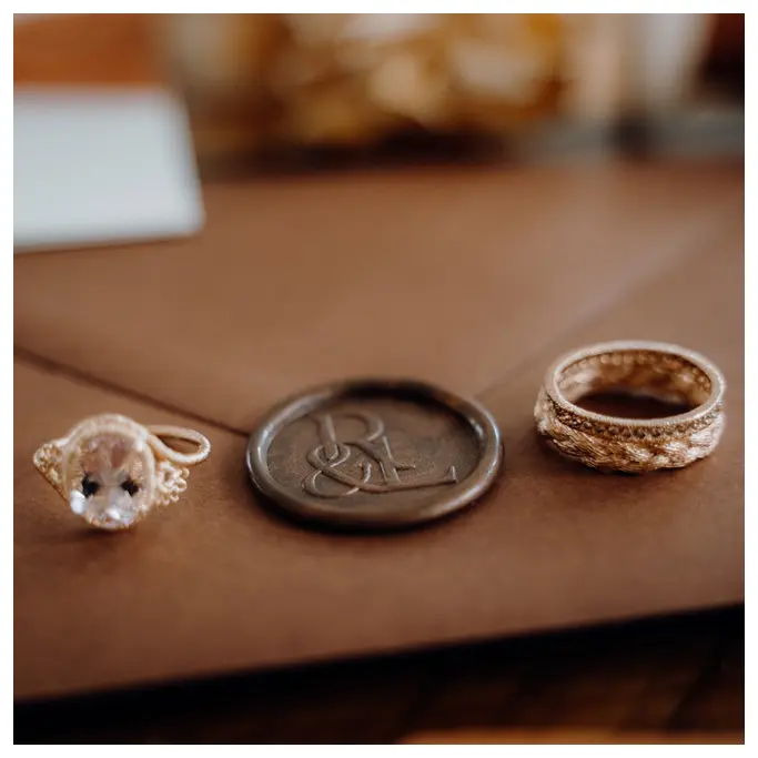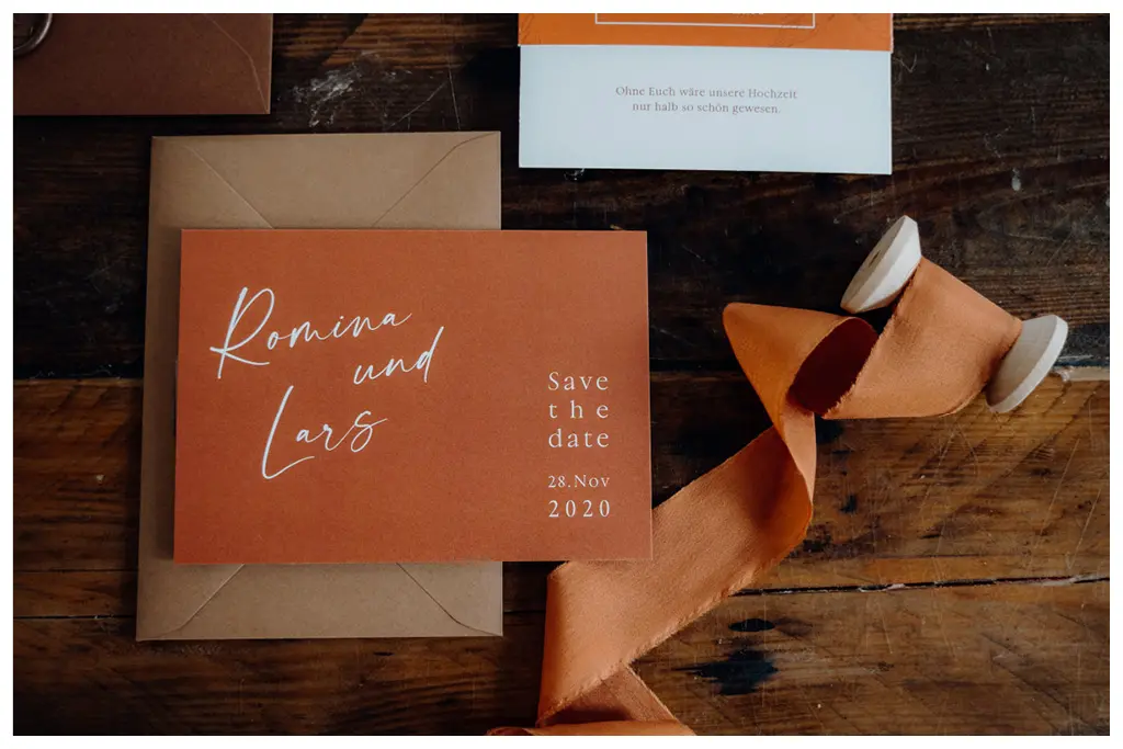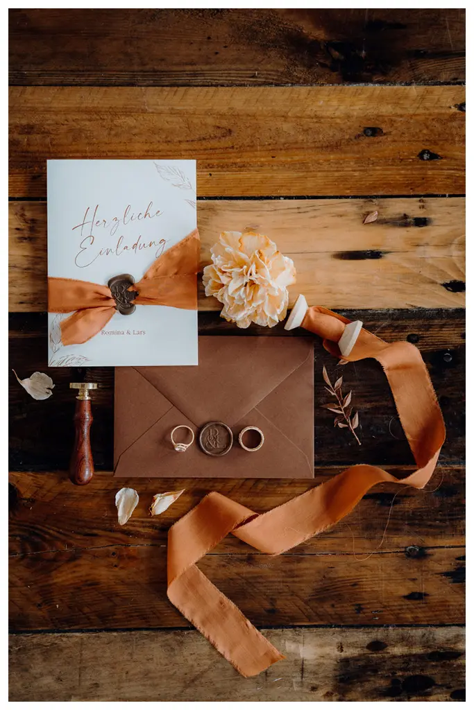 Die Boho-Hochzeitspapeterie wurde auf einem Feinstpapier von Metapaper gedruckt. Als Farbpalette dienten Schattierungen in rostrot. Wir wollten durch die Papeterie bewusst Akzente setzen. Seidenbänder von Magnolias Silk und ein Hochzeitssiegel mit dem extra entwickelten Logo von Romina und Lars wurden als schmückende Elemente eingesetzt.