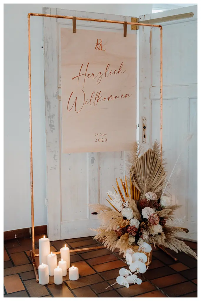 Da Willkommensschilder bei Brautpaaren immer beliebter werden, entschieden wir uns ebenfalls für eines. Hier wählten wir Holz als Grundmaterial und ließen dies bedrucken. Ihr könnt bei uns aber auch andere, spannende Materialien erhalten. Wie beispielsweise Kork, Kunstleder oder Acryl.