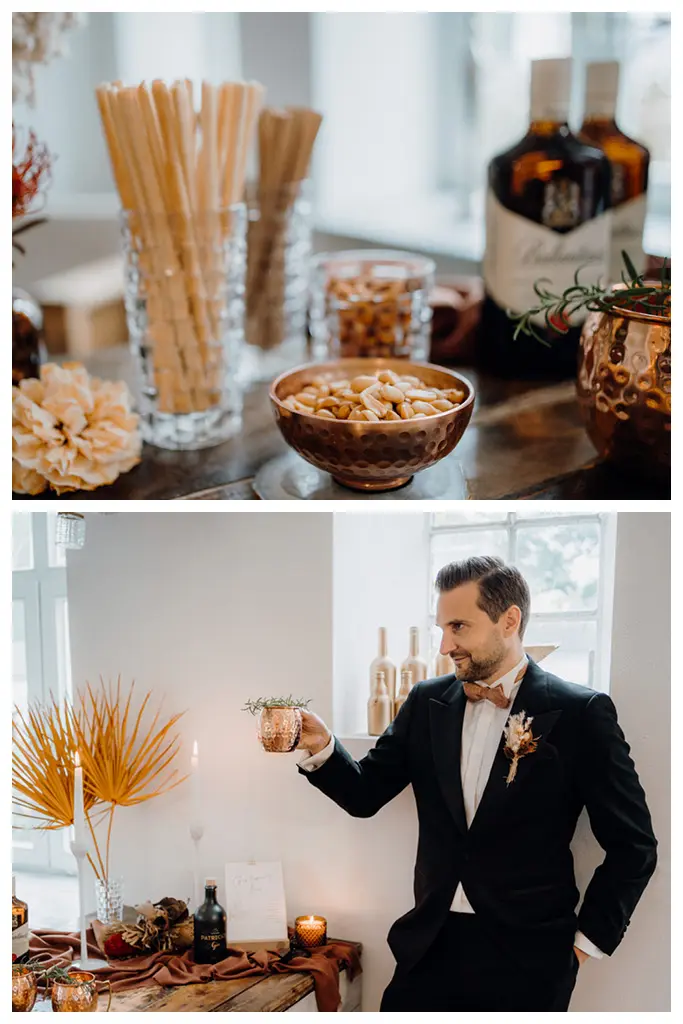 Schmuck durften wir von Brigitte Adolph aussuchen. Habt ihr schon euren Brautschmuck? Schaut euch die Stücke von Brigitte an, ich war sofort verliebt in ihre Kreationen. Vergessen darf ich aber den Bräutigam nicht. Mit den hochwertigen Accessoires von Adam Bows, sah Lars fantastisch aus. Wie ein wahrer Gentleman. Grund genug sich am Hochzeitstag an der Gentlemans Bar einen Moscow Mule zu gönnen.