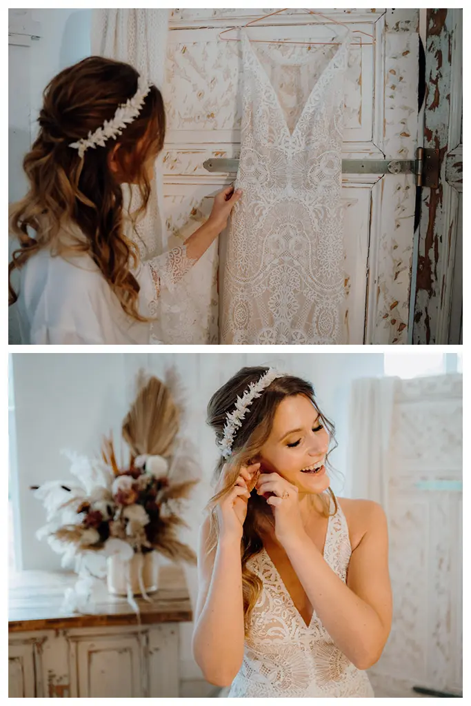 Nun habe ich aber noch gar nicht über unsere wunderschöne Braut Romina geschrieben. Dabei ist Sie das eigentliche Highlight dieser Boho-Hochzeitsinspiration, oder? Romina trägt ein Spitzenkleid, welches wir gemeinsam einige Wochen zuvor bei Theresa von Elbbraut ausgesucht hatten. Ein wahrgewordener Traum.