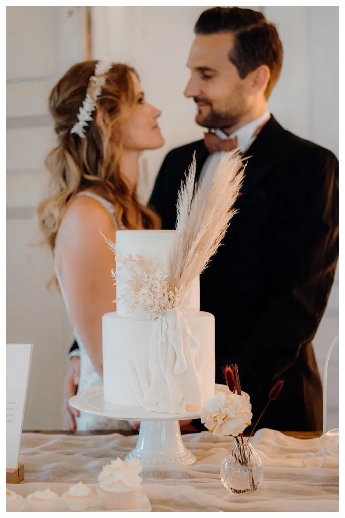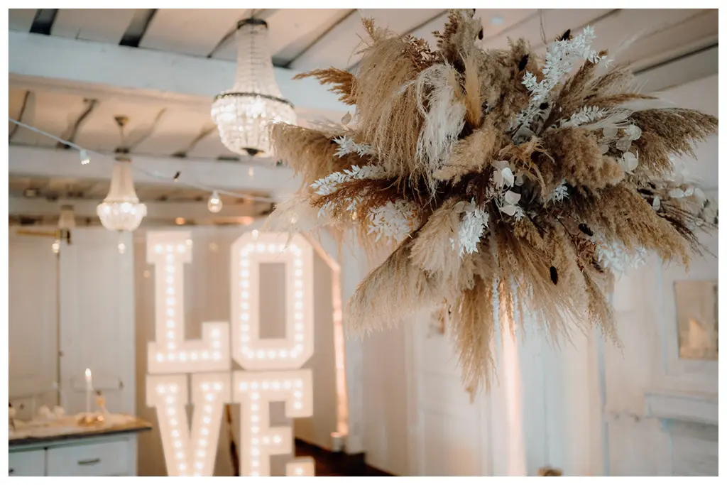 Bloom Flowerstudio zauberte eine hochwertige und elegant-verspielte Blumendekoration. Mit einem Gesteck aus Orchideen, Nelken, und verschiedenen Trockenblumen setzten die Floristinnen unsere Vorstellungen perfekt um. Absolutes Highlight war die „Wolke“ aus Pampasgras über dem Brauttisch.